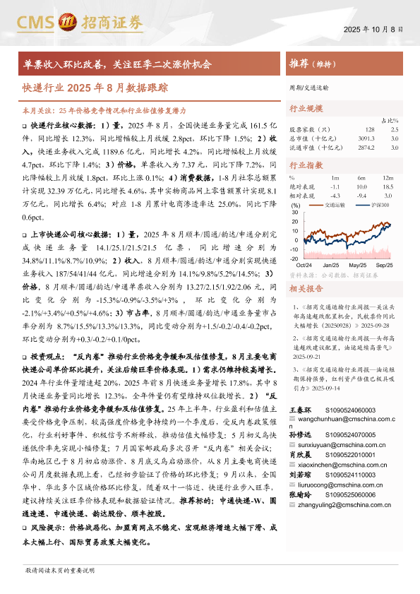 【海通证券】【202508】快递行业2025年8月数据跟踪:单票收入环比改善,关注旺季二次涨价机会-13页