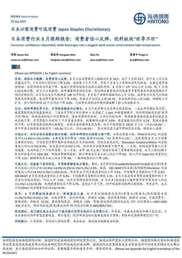 【海通国际】【202509】日本消费行业8月跟踪报告:消费者信心反弹,饮料板块“旺季不旺”-25页