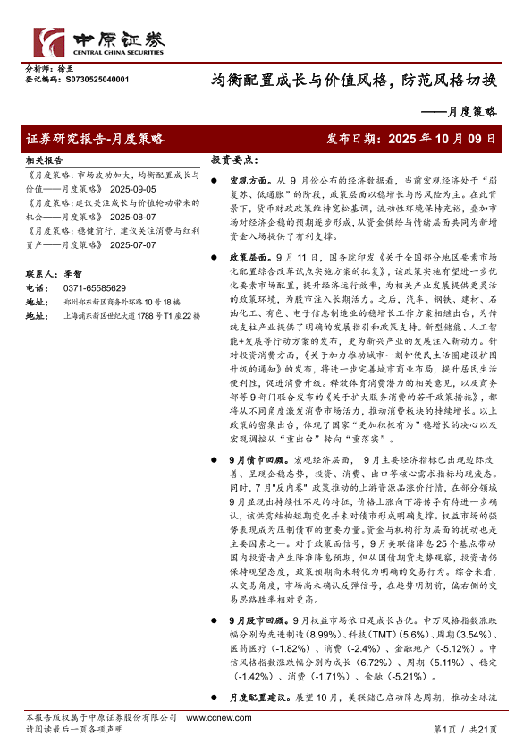 【中原证券】【202510】月度策略:均衡配置成长与价值风格,防范风格切换-21页