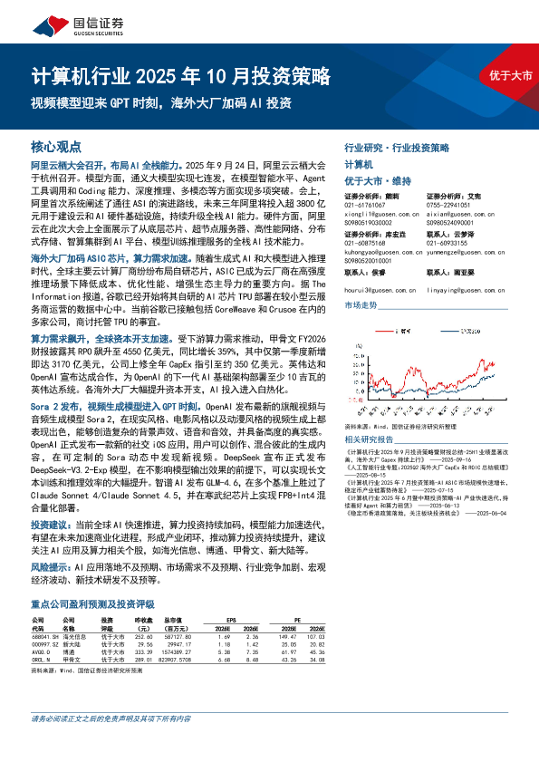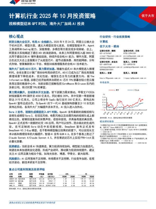 【国信证券】【202510】计算机行业2025年10月投资策略:视频模型迎来GPT时刻,海外大厂加码AI投资-24页
