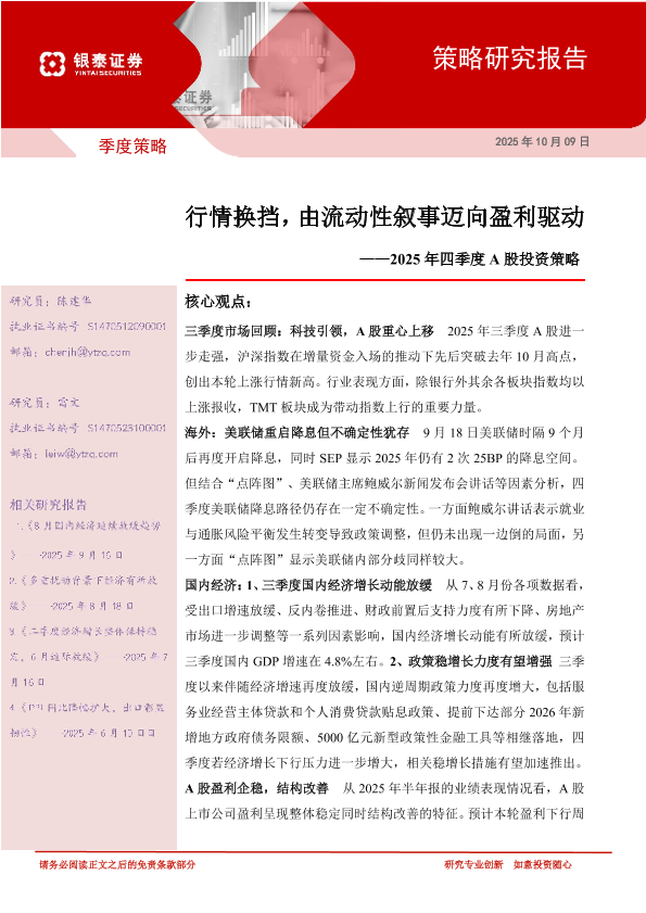 【银泰证券】【202510】2025年四季度A股投资策略:行情换挡,由流动性叙事迈向盈利驱动-23页