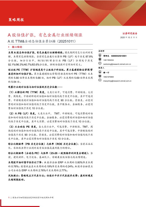 【西部证券】【202510】A股估值扩张,有色金属行业继续领涨-16页