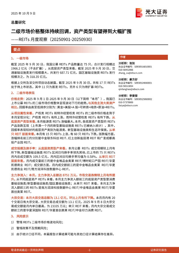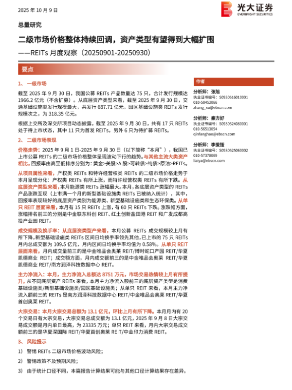 【光大证券】【202509】二级市场价格整体持续回调,资产类型有望得到大幅扩围——REITs月度观察(20250901-20250930)-15页