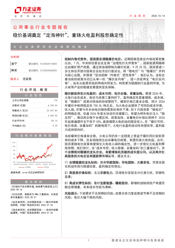 【方正证券】【202510】公用事业行业专题报告:稳价基调奠定“定海神针”,重铸火电盈利股息确定性-10页