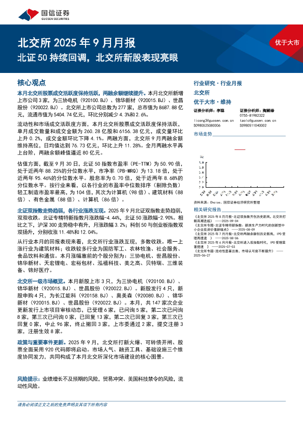 【国信证券】【202509】北交所2025年9月月报:北证50持续回调,北交所新股表现亮眼-31页