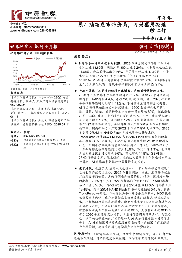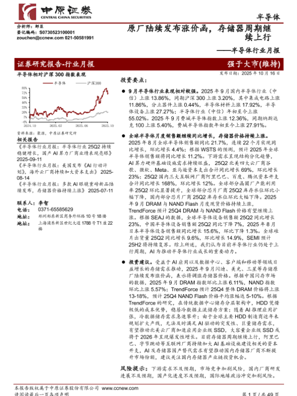 【中原证券】【202510】半导体行业月报:原厂陆续发布涨价函,存储器周期继续上行-49页