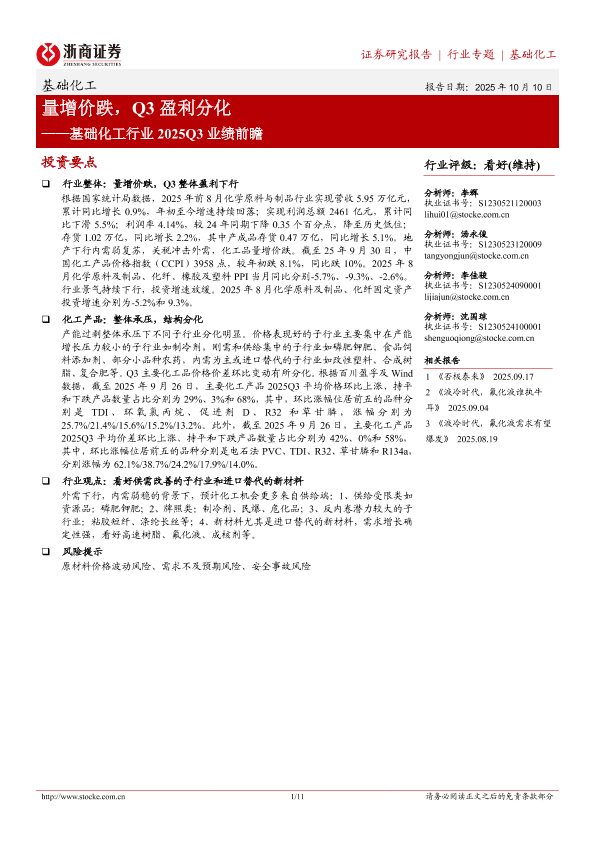【浙商证券】【202510】基础化工行业2025Q3业绩前瞻:量增价跌,Q3盈利分化-11页