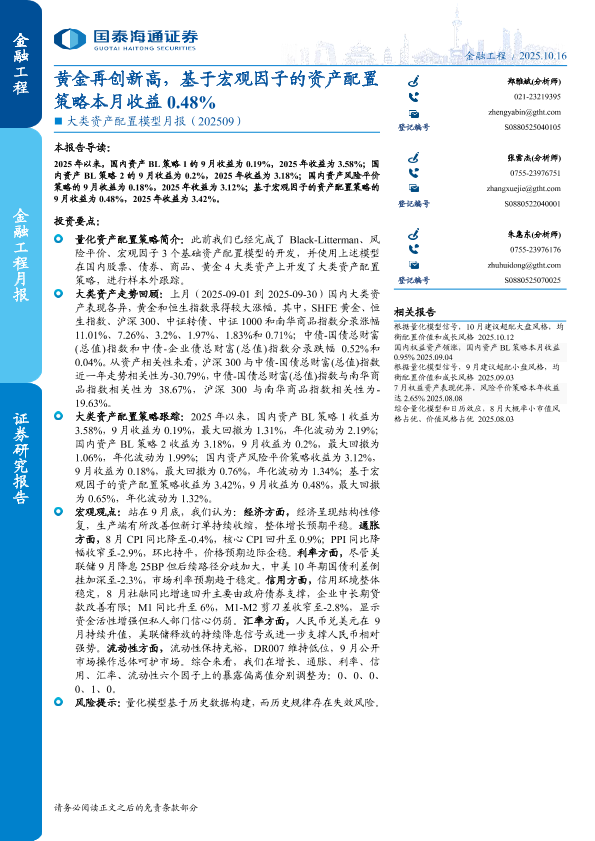 金融工程 资产配置 量化策略 宏观因子 黄金