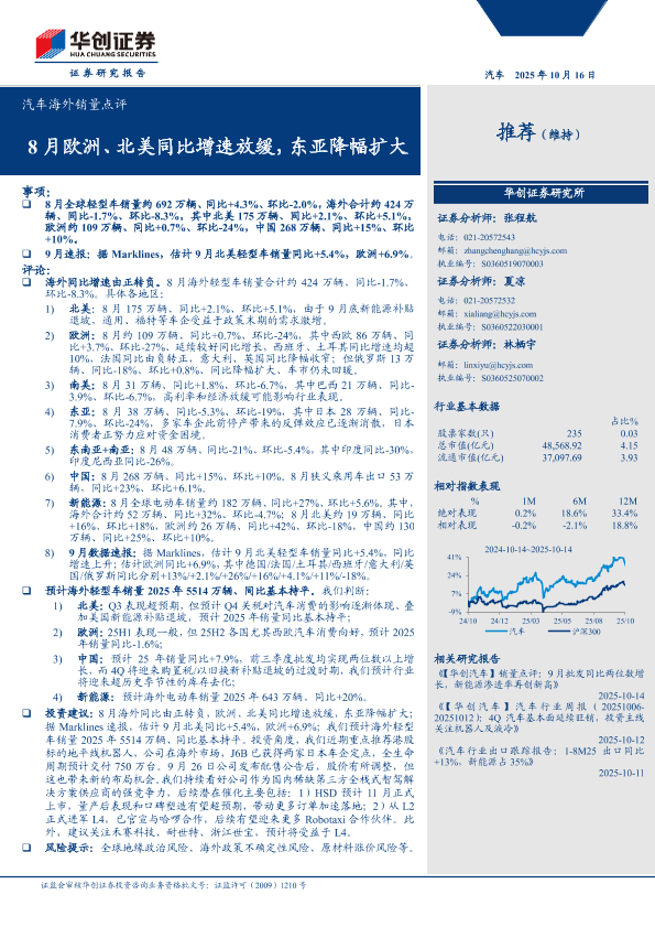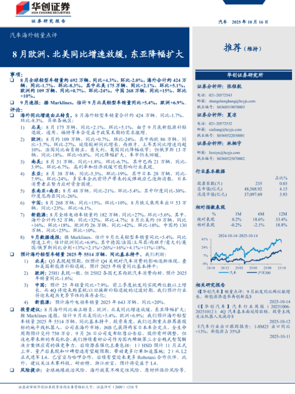 【华创证券】【202410】汽车行业海外销量点评:8月欧洲、北美同比增速放缓,东亚降幅扩大-14页