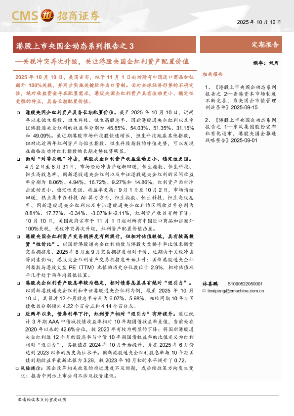 【海通证券】【202510】港股上市央国企动态系列报告之3:关税冲突再次升级,关注港股央国企红利资产配置价值-19页