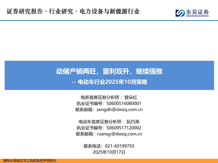 【东吴证券】【202510】电动车行业2025年10月策略:动储产销两旺,量利双升,继续强推-94页