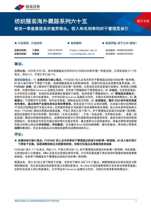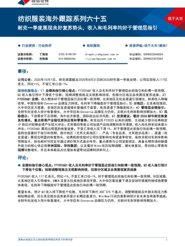 【国信证券】【202510】纺织服装海外跟踪系列六十五:耐克一季度展现良好复苏势头,收入和毛利率均好于管理层指引-10页