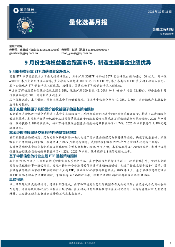 【国金证券】【202509】量化选基月报:9月份主动权益基金跑赢市场,制造主题基金业绩优异-11页