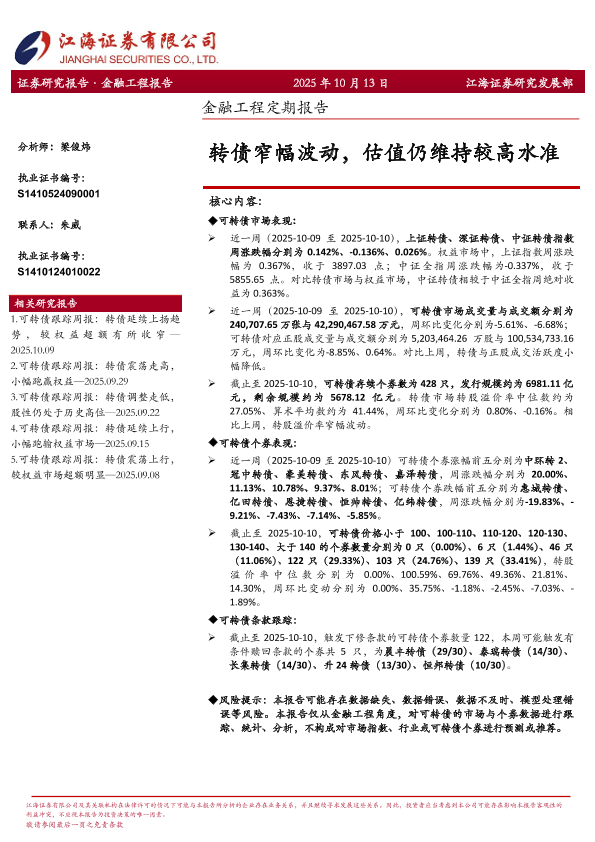 【江海证券】【202510】转债窄幅波动,估值仍维持较高水准-12页