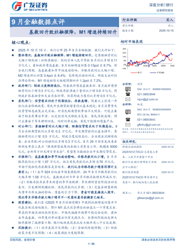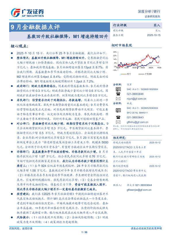 【广发证券】【202510】银行业9月金融数据点评:基数回升致社融微降,M1增速持续回升-33页