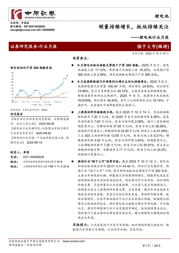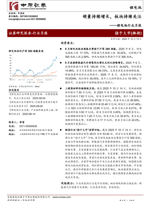 【中原证券】【202510】锂电池行业月报:销量持续增长,板块持续关注-24页