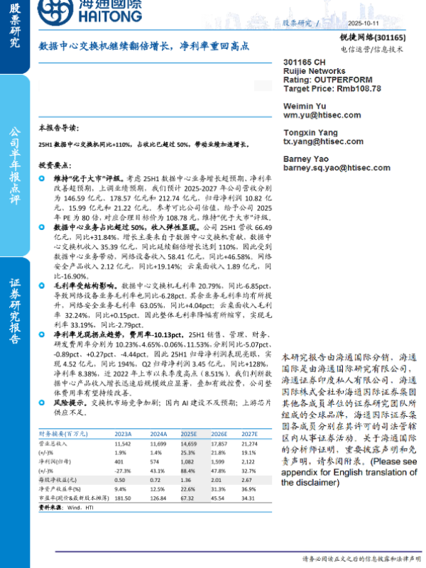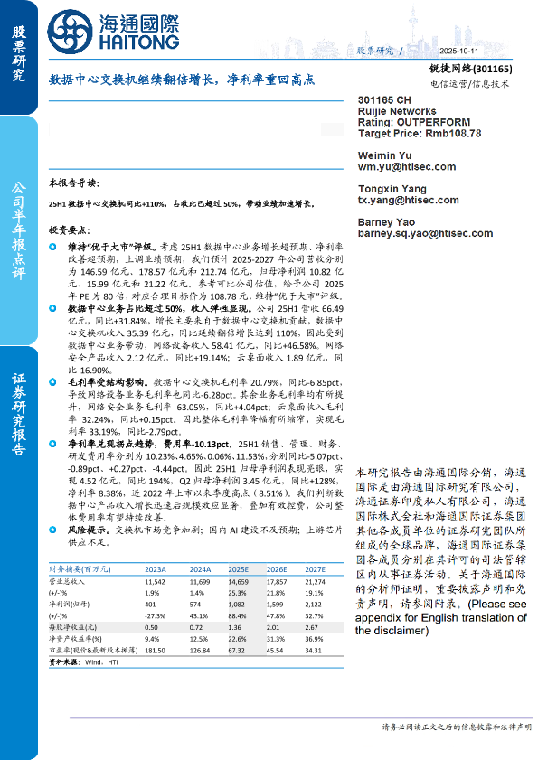 【海通国际】【202510】锐捷网络(301165)数据中心交换机继续翻倍增长,净利率重回高点-11页