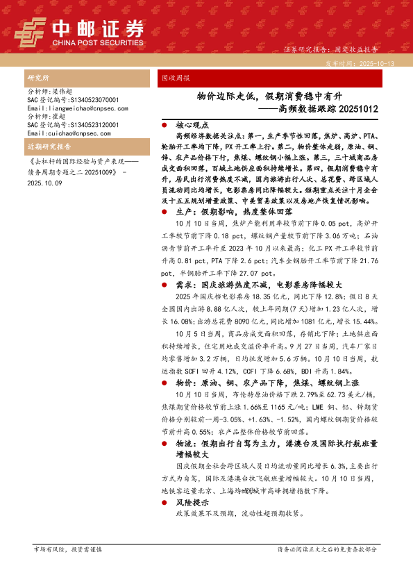【中邮证券】【202510】物价边际走低,假期消费稳中有升——高频数据跟踪-15页