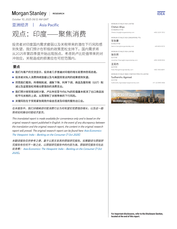 【Morgan Stanley】【202510】亚洲经济 观点 印度——聚焦消费-10页