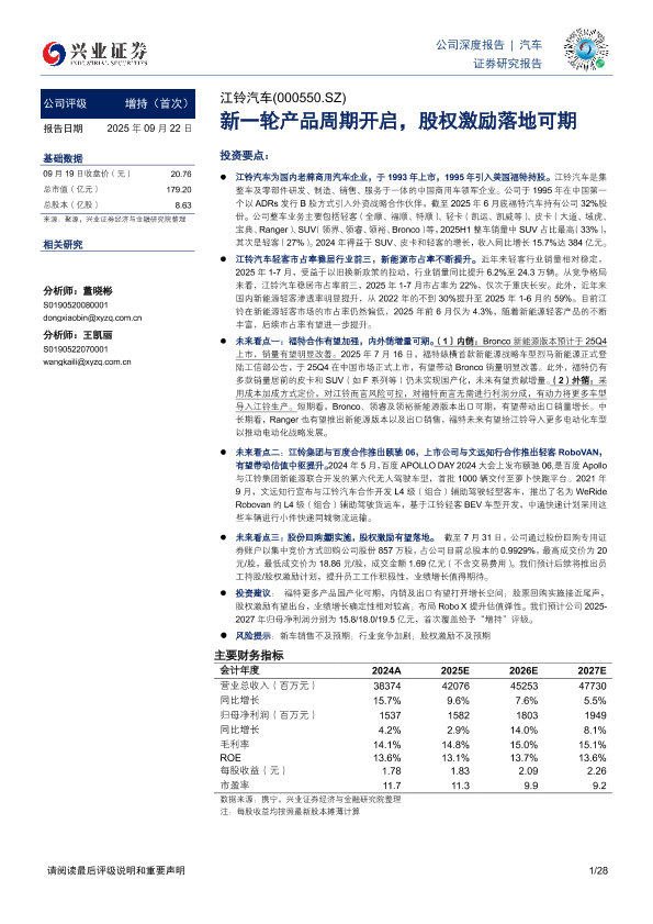 江铃汽车 轻客市场 福特合作 新能源车 股权激励
