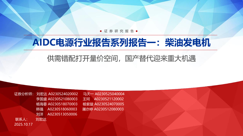 【申万宏源】【202510】AIDC电源行业报告系列报告一:柴油发电机,供需错配打开量价空间,国产替代迎来重大机遇-31页