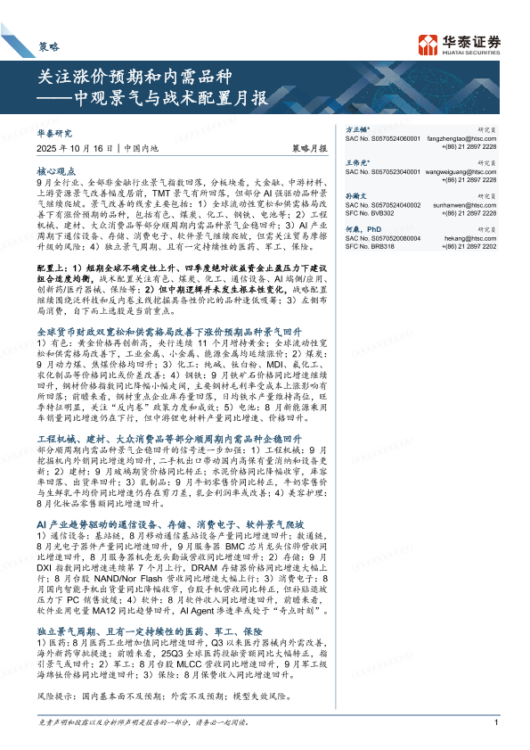 【华泰证券】【202510】中观景气与战术配置月报,关注涨价预期和内需品种-29页