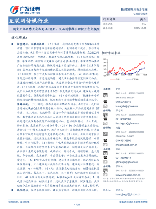 【广发证券】【202510】互联网传媒行业:阅文开办创作大会布局AI漫剧,火山引擎推出四款豆包大模型-24页