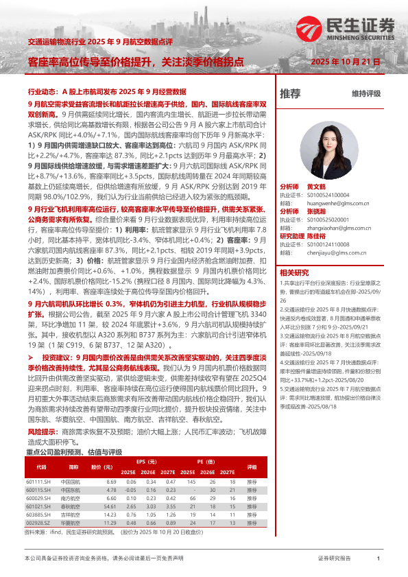 【民生证券】【202510】交通运输物流行业2025年9月航空数据点评:客座率高位传导至价格提升,关注淡季价格拐点-16页