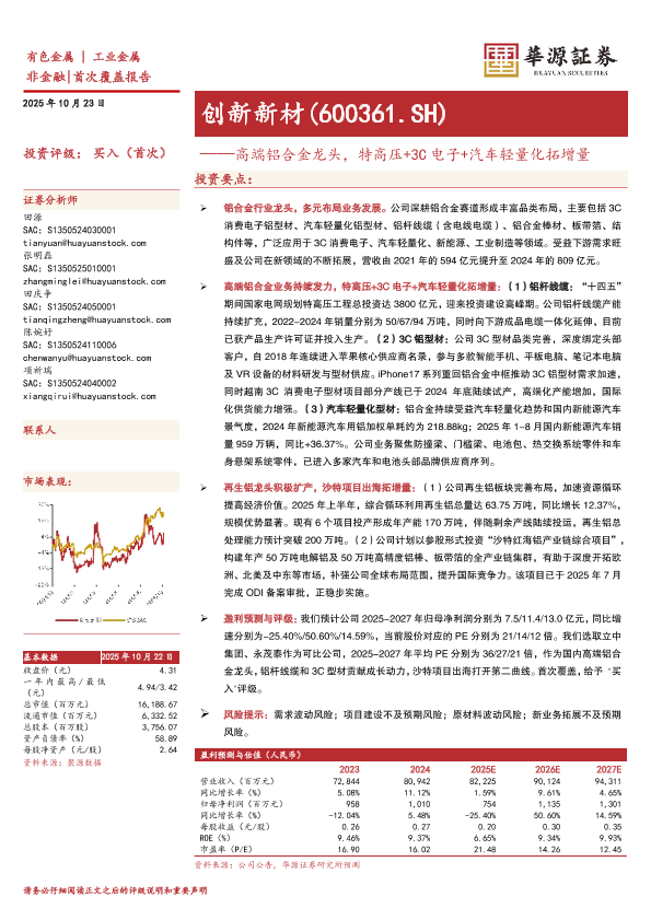 【华源证券】【202510】创新新材(600361)高端铝合金龙头,特高压+3C电子+汽车轻量化拓增量-18页