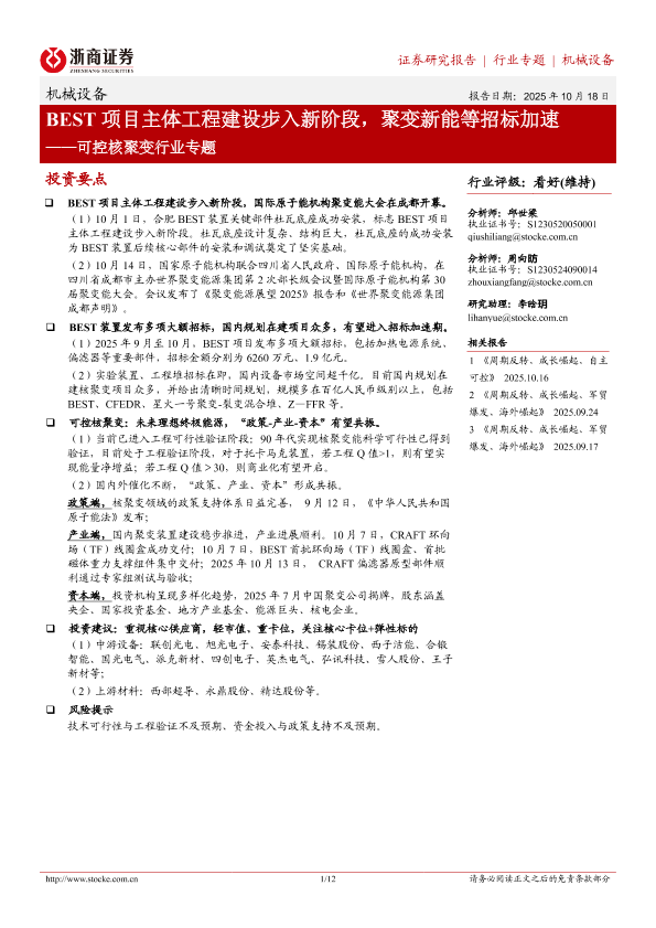 【浙商证券】【202510】可控核聚变行业专题:BEST项目主体工程建设步入新阶段,聚变新能等招标加速-12页