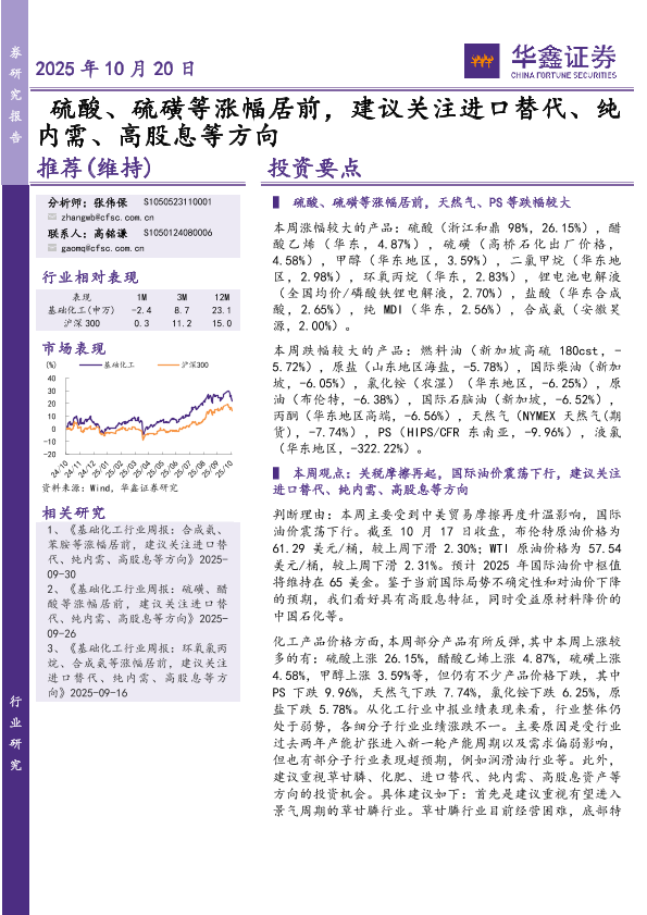 【华鑫证券】【202510】基础化工行业研究:硫酸、硫磺等涨幅居前,建议关注进口替代、纯内需、高股息等方向-34页
