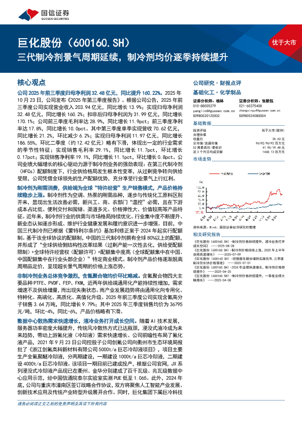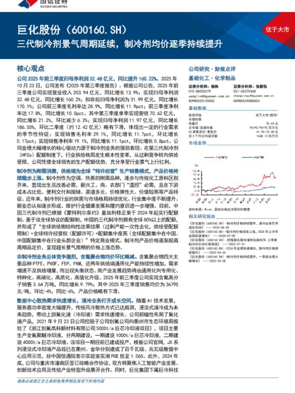 【国信证券】【202510】巨化股份(600160)三代制冷剂景气周期延续,制冷剂均价逐季持续提升-10页