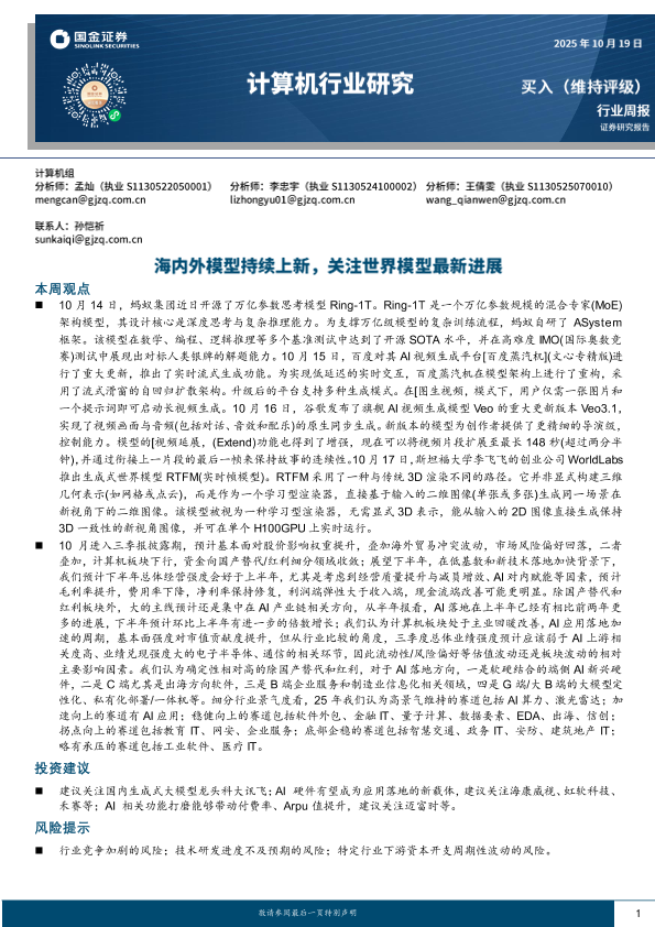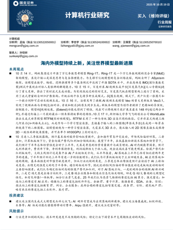 【国金证券】【202510】计算机行业研究:海内外模型持续上新,关注世界模型最新进展-10页