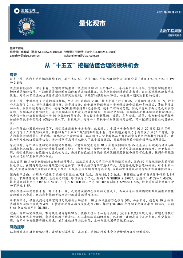 【国金证券】【202510】量化观市:从“十五五”挖掘估值合理的板块机会-12页