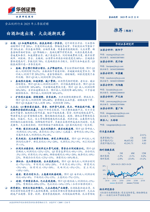 【华创证券】【202510】食品饮料行业2025年三季报前瞻:白酒加速出清,大众逐渐改善-17页