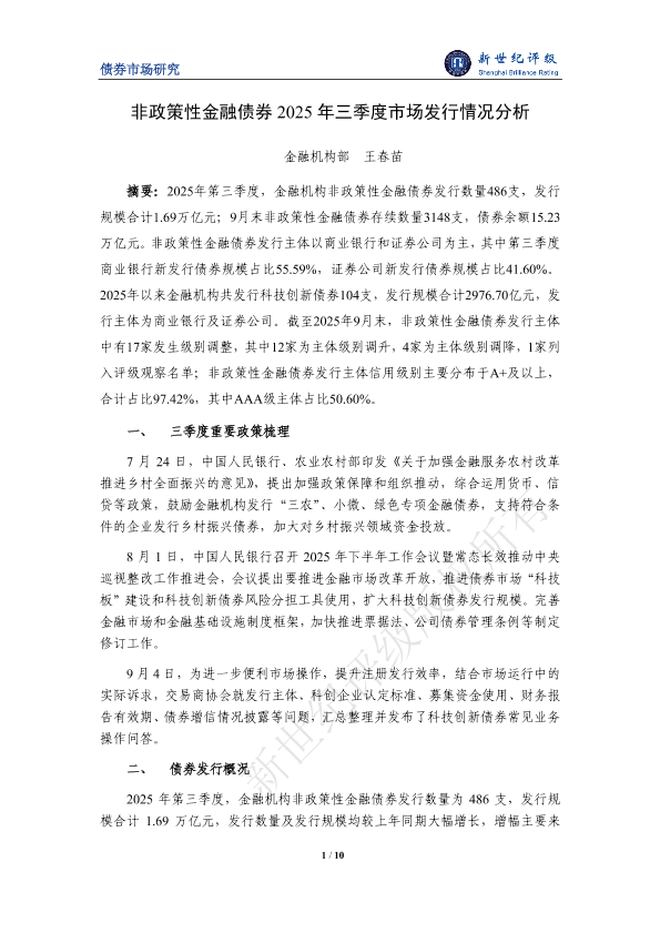 【金融机构部 王春苗】【2025】非政策性金融债券2025年三季度市场发行情况分析-10页