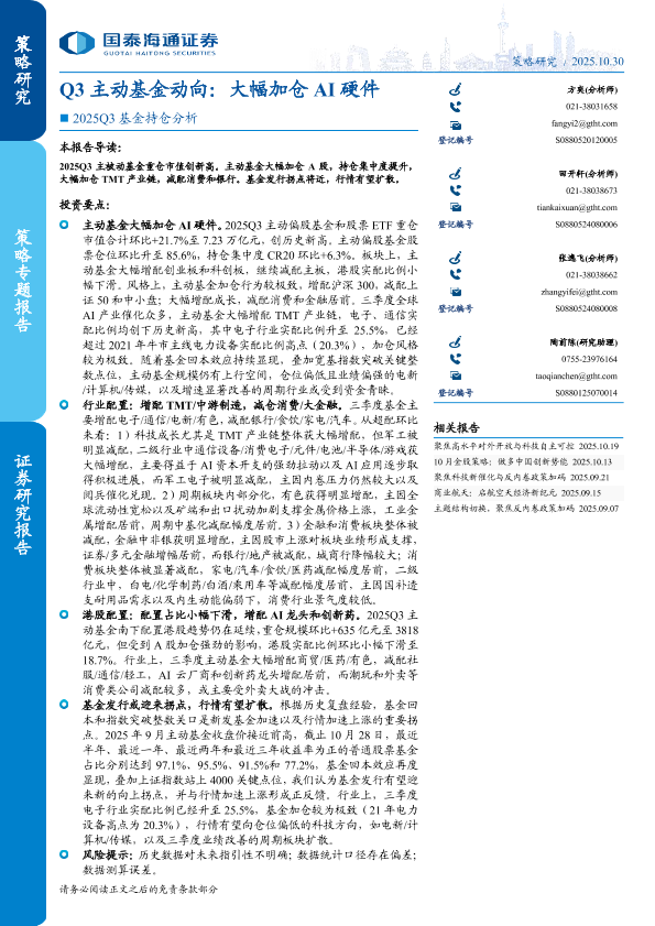 【国泰海通证券】【202510】Q3主动基金动向:大幅加仓 AI硬件-16页