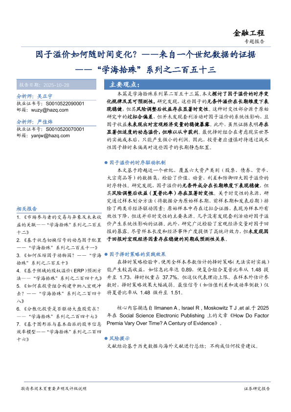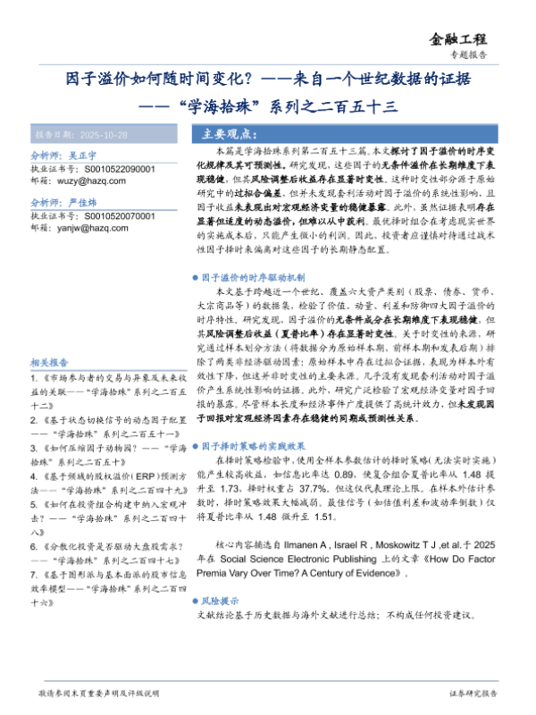 【华安证券】【202510】因子溢价如何随时间变化?——来自一个世纪数据的证据-26页