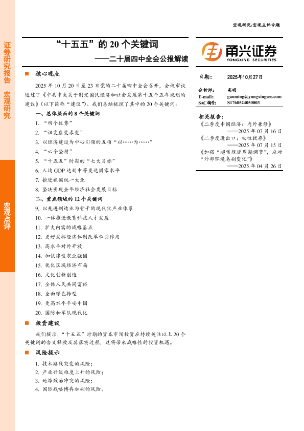 【甬兴证券】【202510】“十五五”的20个关键词——二十届四中全会公报解读-12页