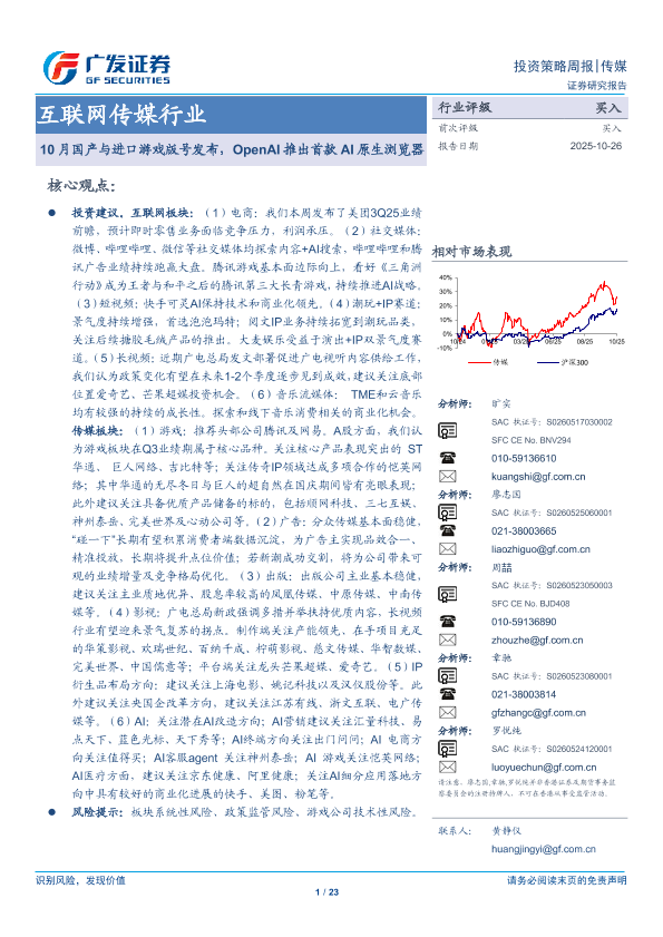 【广发证券】【202510】互联网传媒行业:10月国产与进口游戏版号发布,OpenAI推出首款AI原生浏览器-23页