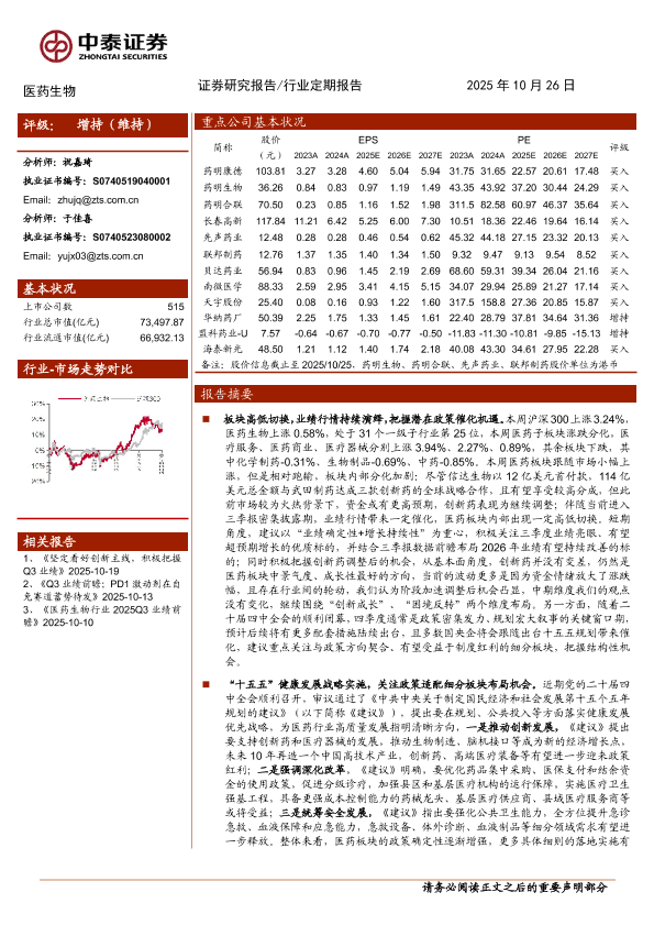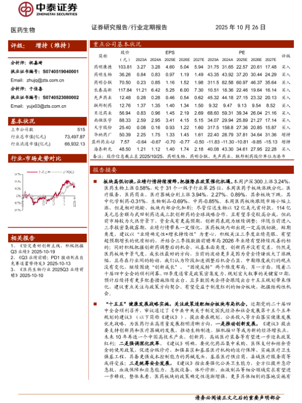 【中泰证券】【202510】医药生物行业:业绩行情持续演绎,“十五五”规划继续强调创新发展-12页