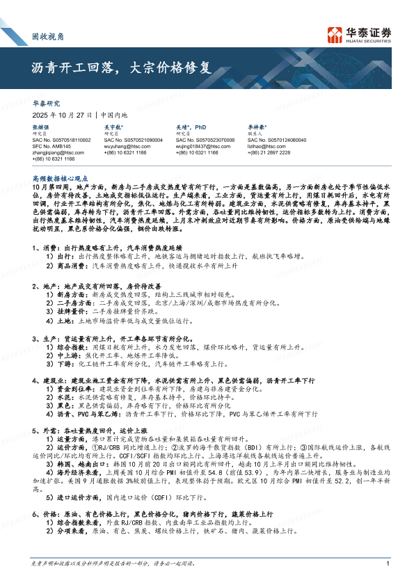 【华泰证券】【202510】固收视角:沥青开工回落,大宗价格修复-13页