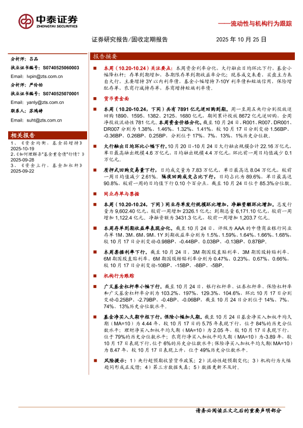 【中泰证券】【202510】流动性与机构行为跟踪:基金降久期-12页