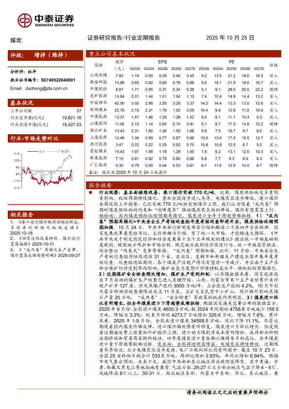【中泰证券】【202510】煤价继续走强涨幅收窄,供需边际改善后市乐观-23页