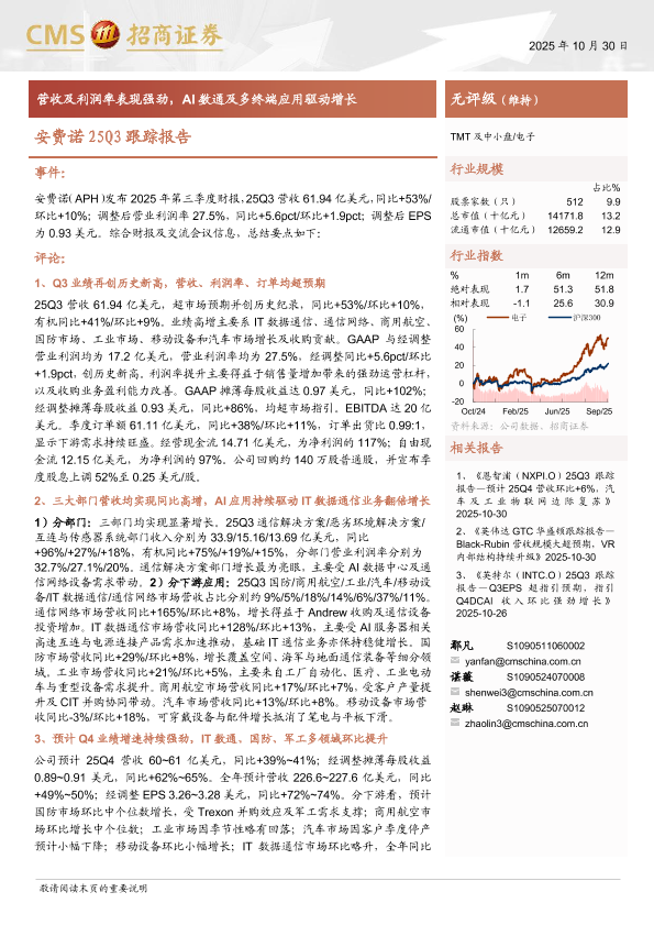 【海通证券】【202510】电子行业安费诺25Q3跟踪报告:营收及利润率表现强劲,AI数通及多终端应用驱动增长-13页