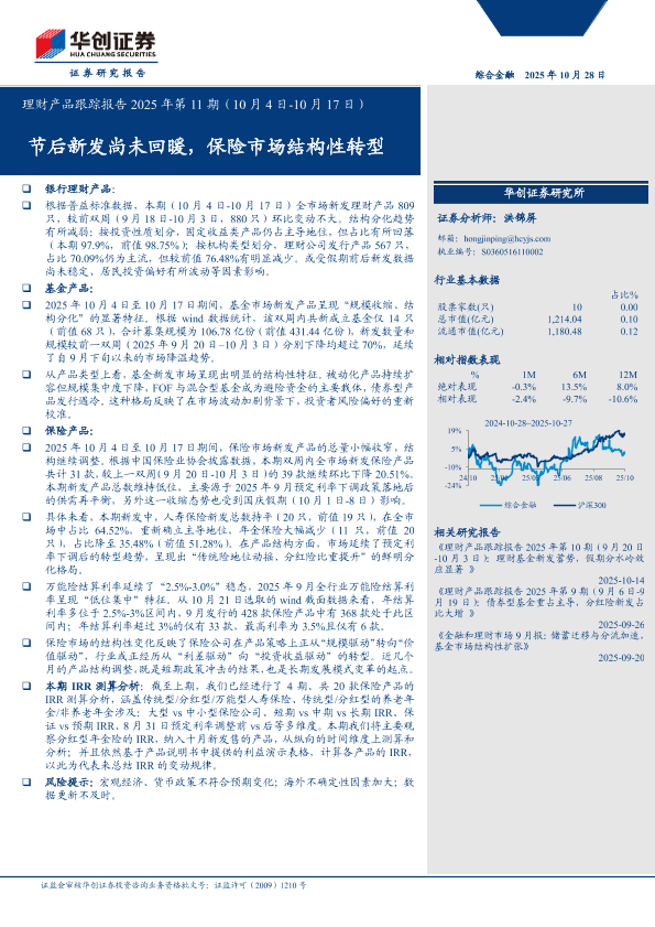 【华创证券】【202510】理财产品跟踪报告2025年第11期(10月4日-10月17日):节后新发尚未回暖,保险市场结构性转型-15页