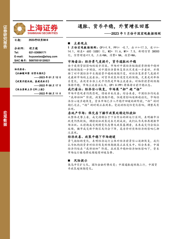 【上海证券】【20230208】2023年1月份中国宏观数据预测:通胀、货币平稳,外贸增长回落-15页