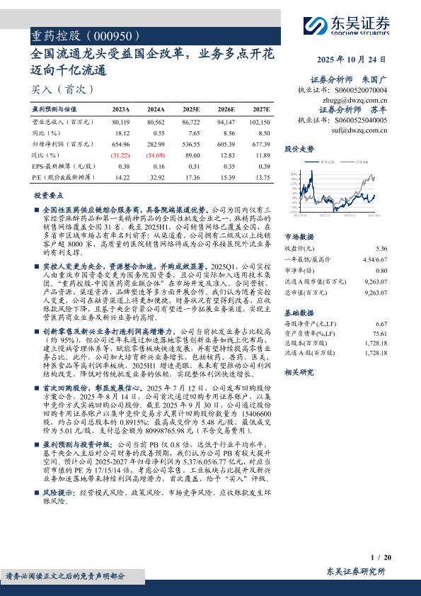 【东吴证券】【202510】重药控股(000950)全国流通龙头受益国企改革,业务多点开花 迈向千亿流通-20页