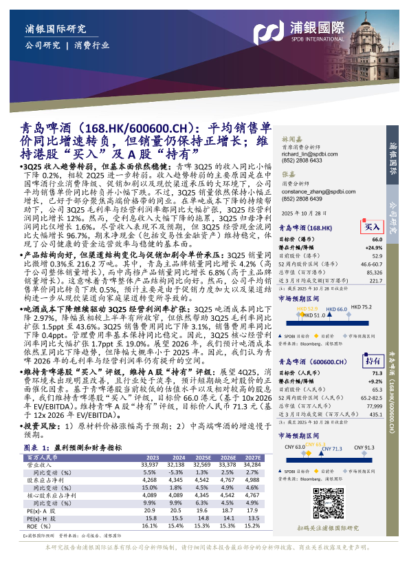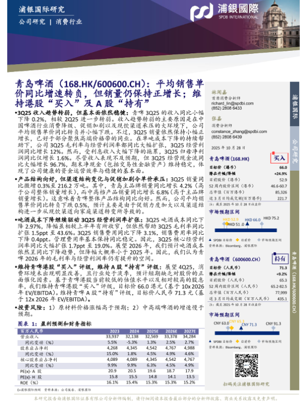 【浦银国际】【202510】青岛啤酒(600600)平均销售单价同比增速转负,但销量仍保持正增长;维持港股“买入”及A股“持有”-10页