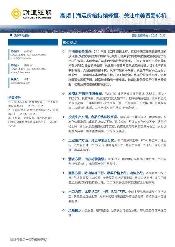 【财通证券】【202510】高频|海运价格持续修复,关注中美贸易转机-14页